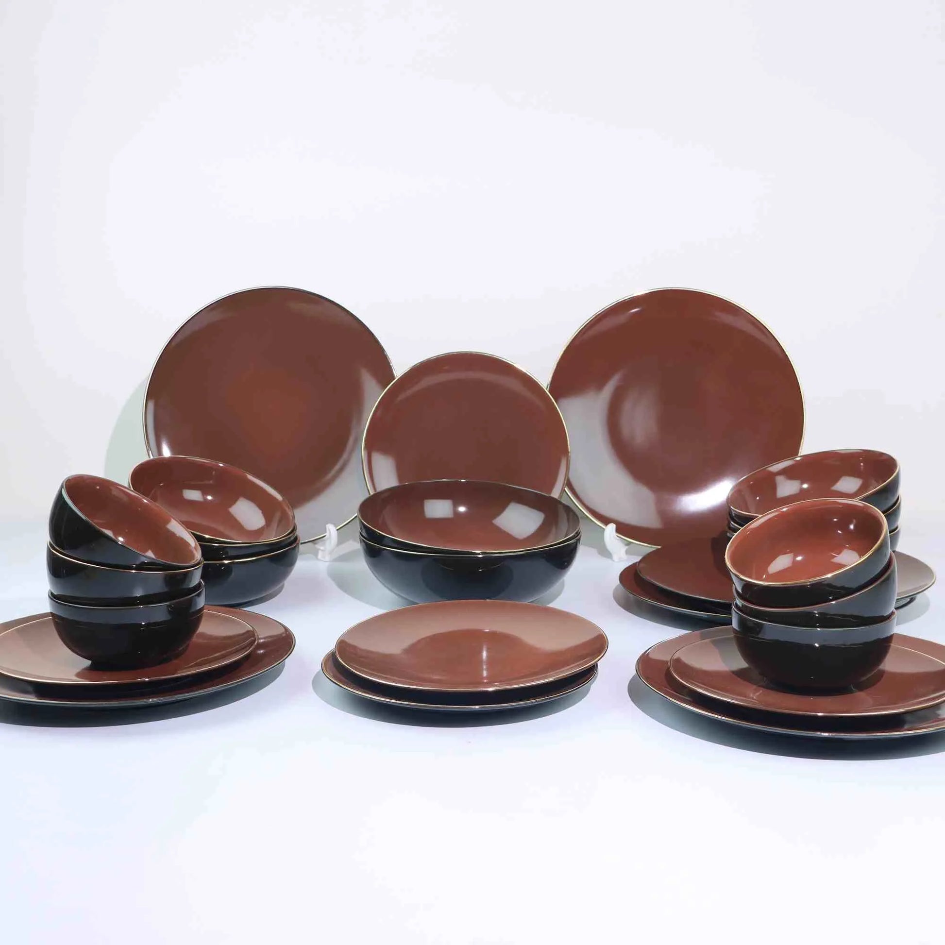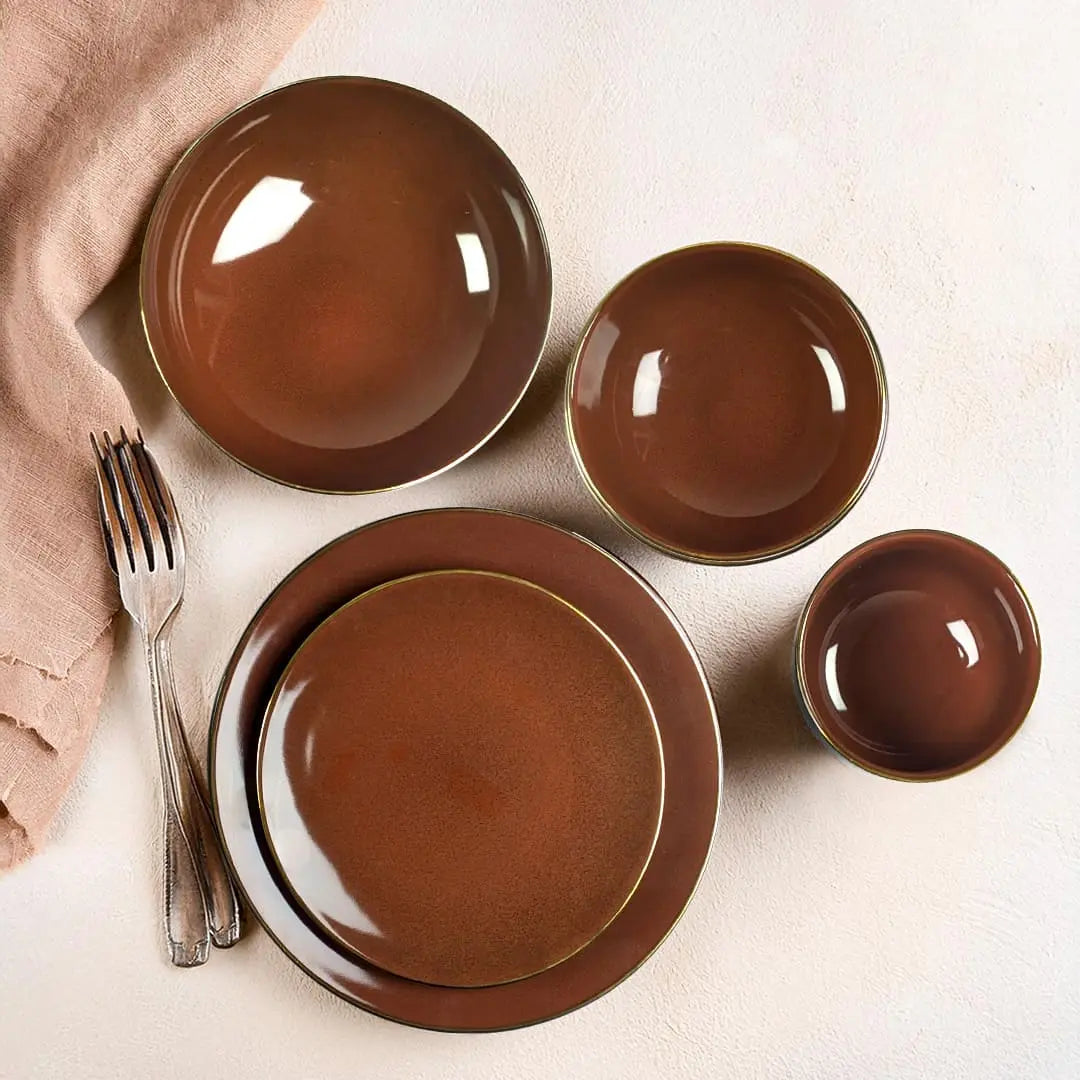 Enhance your dining experience with the Lamer Sienna Dinner Set, a luxurious combination of warmth and elegance. Featuring a sophisticated sienna hue with delicate gold lining, this ceramic dinnerware set adds a touch of class to every meal.